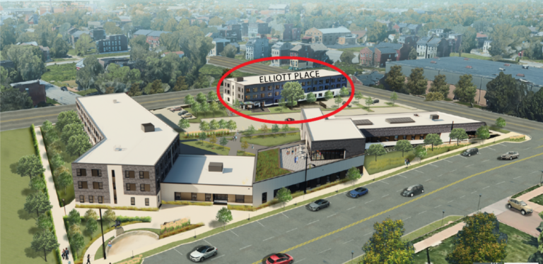 After Phase One is completed, Phase Two constructs a 20,000 sq. ft. permanent housing building  in the back-right corner of the campus. Elliot Place–expected to open in 2023–will add 39 units of permanent housing to replace an aging existing building judged inefficient for rehab.