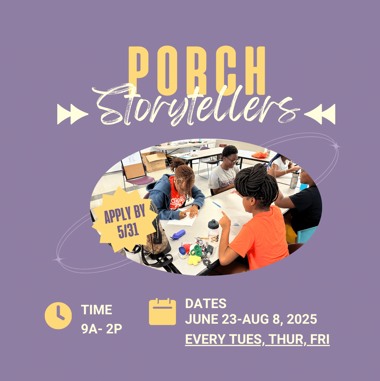 Each week, PORCH Storyteller participants try a new art form and learn how different mediums affect how we tell stories. Participants will paint, draw, collage, write poetry, and more. Exact art forms dependent upon community volunteers.