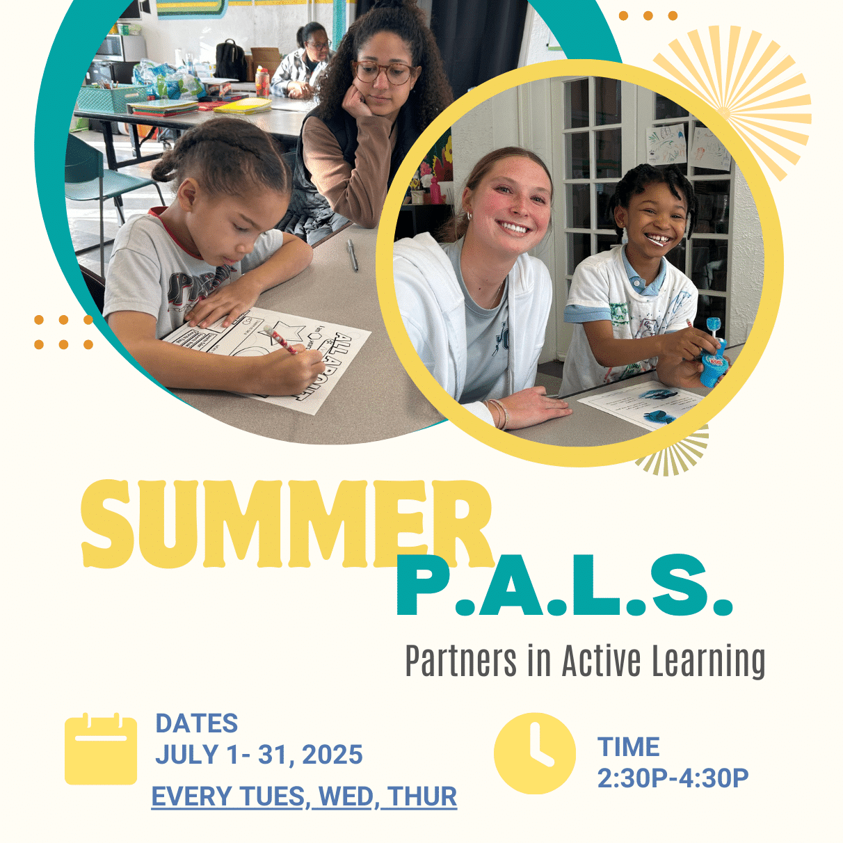 Summer PALS (Partners in Active Learning) is similar to our PALS program happening throughout the school year. This program is geared towards students in grades K-5 that could benefit from additional academic support before the new school year. Students will receive academic support & emotional enrichment.